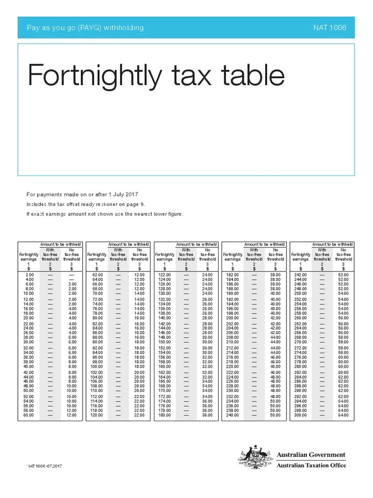 Web Fortnightly Tax Table 2 Fortnightly Tax Table Amount To Be Withheld Fortnightly Earnings With Tax‑Free Threshold No Tax‑Free.