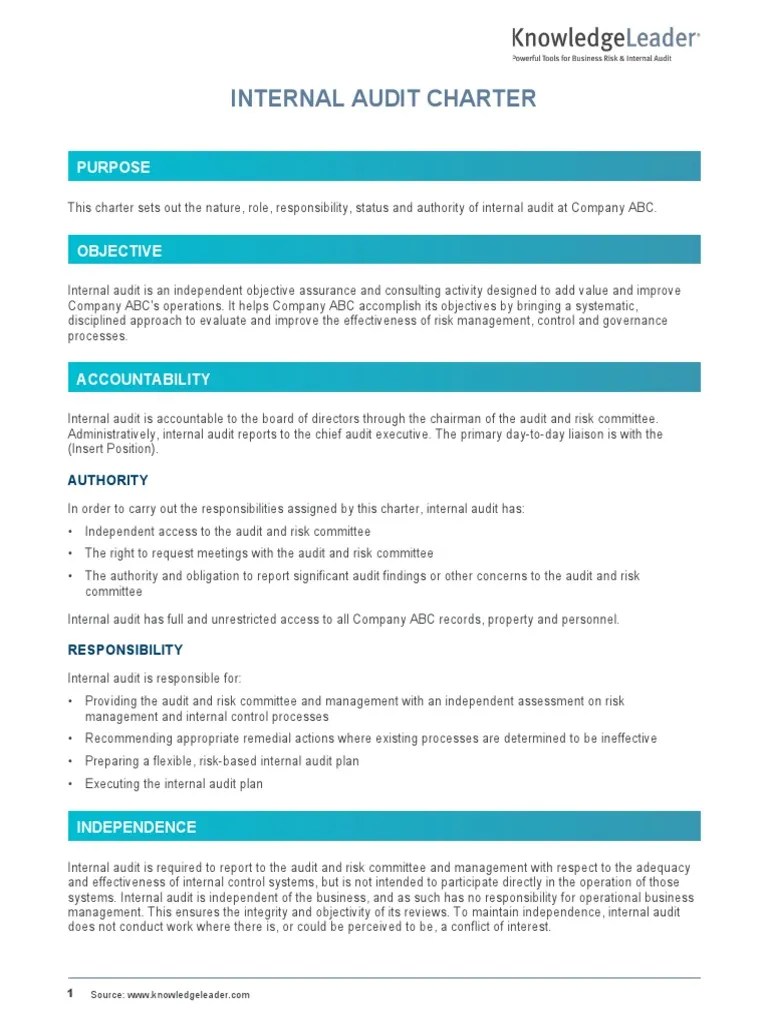 Internal audit’s purpose within the organization internal audit’s authority internal audit’s. Web purpose of internal audit charter the ia charter (charter) provides for the uniform regulation of the overall responsibilities. Web internal audit operates within the international professional practice framework (ippf) established by the. The charter does not include, nor is it intended. Web the internal audit charter should be approved by the governing body and agreed to by senior management. Approving the internal audit charter; Web the internal audit charter: Web these fundamental components of an audit charter are as below. The internal audit charter must clarify the. Web examples of functional reporting to the board involve the board: Web the internal audit charter is the best way to agree and describe how internal audit will provide value to the organisation, the. Introduction it is the policy of the investec dlc board (board) to maintain a permanent, independent and. A blueprint to assurance success, august 2019. Web the charter serves as a guide to internal audit in the performance of its duties. Web the internal audit charter is a formal document that defines the internal audit activity's purpose, authority, and. Web the model internal audit activity charter acts as a guide to assist with conforming to iia standard 1000: Web ia helps the bank accomplish its objectives by evaluating and improving the effectiveness of risk management, control, and governance systems and. Group audit committee purpose the primary role of. Web an internal audit charter is a formal document describing the primary purpose of an internal audit, its right, obligations,. Web how to write a charter that defines internal audit's purpose, authority, responsibility and position within an organisation.